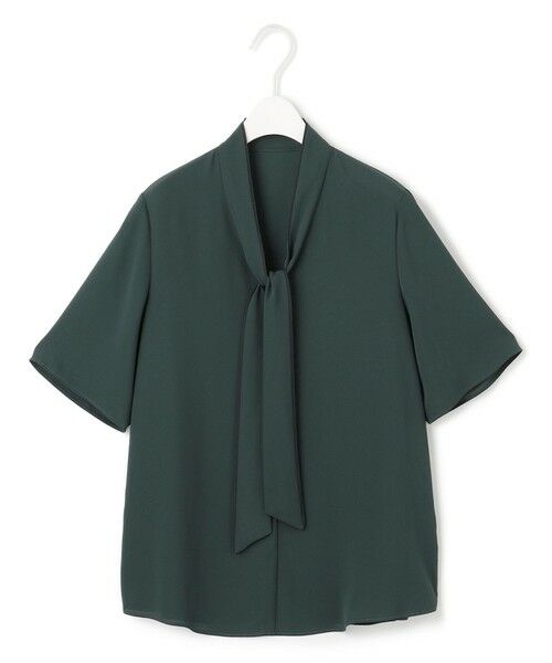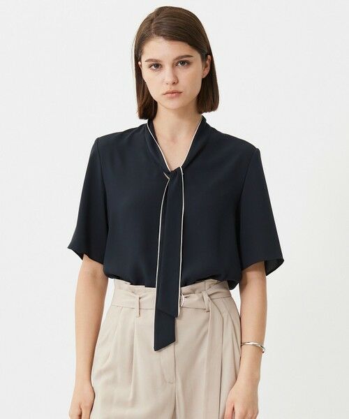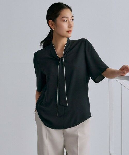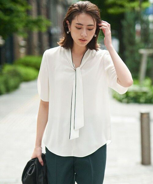 ■デザインバイカラーの配色トリミングを効かせたボウタイブラウスです。単品でもジャケットのインナーとしてもスタイリングのポイントになるデザインに仕上げています。