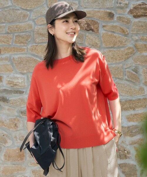 接触冷感・UVカット機能付き!人気のニットに新色が追加!■デザイン美しいドレープ感のあるキレイめなTシャツライクニットです。程よくゆとりのあるシルエットですが、落ち感のある素材なのでラフな印象になりすぎないデザイン。ジャケットやニットを羽織ってもストレスを感じにくく、ブラウスのようにきちんと感もあるのでインナーとしても最適です。着丈に前後差があるのでパンツスタイルにも合わせやすく、シーンを問わず活躍する汎用性の高いトップスです。■素材レーヨンとストレッチポリエステルを撚糸した糸を使用しております。ストレッチ性があるので動きやすく、身体に馴染みやすいのでストレスフリーな着心地です。撚りを強くかけているので、表面がクレープ状になっており、ドライタッチなシャリ感と清涼感がありながら、エレガントなドレープ性を合わせ持った素材です。接触冷感、UVカット機能付きです。■同アイテムの他のカラープルオーバー ニット(KRWRCM0452)