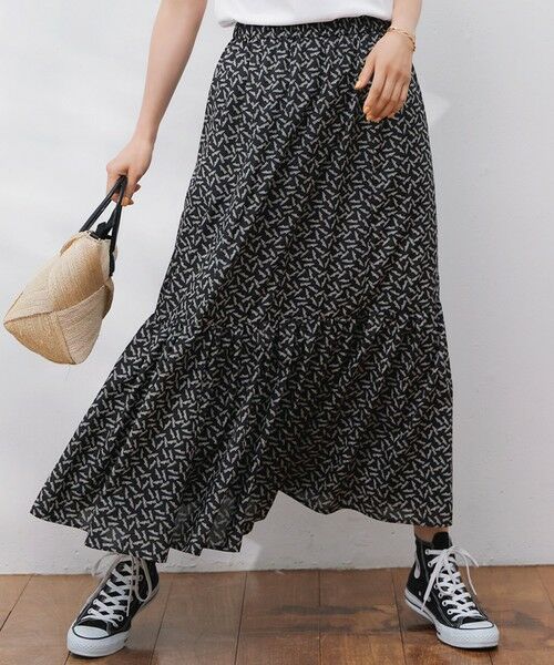 夏らしいモチーフのプリント生地を使ったティアードスカート。動くたびに揺れるシルエットが華やかな印象に。ウエストはゴムギャザー仕様で着やすく、腰回りにボリュームが出すぎないようなシルエットに仕上げています。合わせるトップス次第でオン・オフ問わず着用可能なアイテムです。ご自宅で洗濯可能なイージーケアなのも嬉しいポイント。カラーは、シックな印象のブラックプリント(#505)と品の良い着こなしを叶えるネイビープリント(#575)の2色展開です。