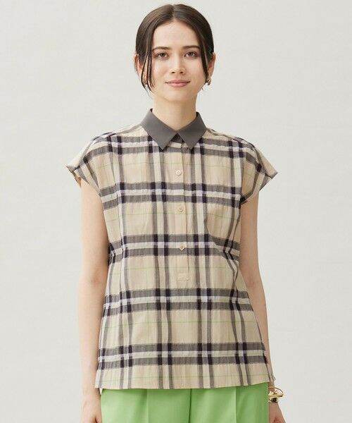 無地の襟がアクセントになったチェック柄ブラウス■デザイン大胆なチェック柄が目を惹くシャツカラーのプルオーバーブラウスです。無地で引き締めた襟が大人っぽく、デザインのポイントになっています。ボディラインを拾いにくいゆとりを持たせたシルエットは、程よく体から離れるボリューム感で涼しく着て頂けます。■素材トルコのテキスタイルメーカーACAR社の生地を使用しております。タテ糸にリサイクルポリエステル、ヨコ糸にナイロン糸を使用した先染め素材です。繊細に光るブライト糸を使用しているのでささやかな光沢感があり、コットンならではの清涼感と程よい透け感が特徴の素材です。自由区オリジナルのチェック柄でお作りしました。軽く柔らかいタッチが特徴のウォッシャブル素材です。■同素材アイテムワンピース(OPWRGA0109)スカート(SKWRGA0109)