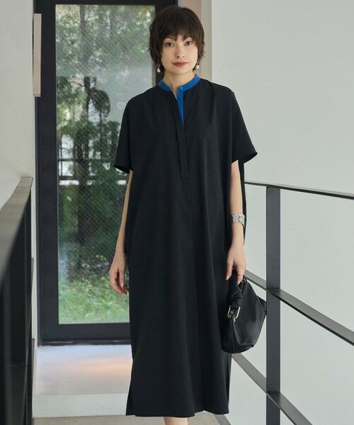 ■デザイン分量感がポイントのバンドカラーワンピースです。襟元と比翼奥には配色のディテールを入れ、ボリューム感はありつつもすっきりと引き締めたデザインが特徴です。ボタンを開けて少し後ろに抜くとより配色感が出ておすすめです。動きのあるヘムデザインで一枚で着映える一着。