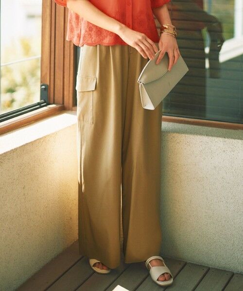 大きめなポケットとデザインフラップがポイントになったワイドパンツ■デザイン2タックのフレアワイドパンツです。大きなサイドポケットや左のベルト下にはデザインフラップをあしらい、キレイめな素材でありながらカジュアルなディテールを加えたデザインにしています。素材の落ち感で、すとんと落ちるボトムは、トレンドの短め丈のトップスとも好相性です。後ろのウエストベルトにはゴムギャザーを入れているので体に程よくフィットする着心地です。■素材タテ糸の滑らかでドレーピーな風合いの再生繊維に、ヨコ糸のナイロンで軽さと着心地をプラスしました。最後にバイオ加工を施すことで、キレイめになり過ぎず、シーンレスなビンテージ感を表現しているストレッチ素材になります。接触冷感、UVカット機能付きのウォッシャブル素材です。■同素材アイテムスカート(SKWRGA0108)