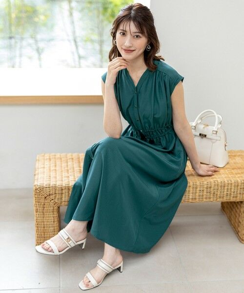 ・ウエストのギャザーデザインがポイントのワンピース・すっきりとしたネックラインと、きらりと光るボタンが上品な印象・ウエストのギャザーはゴム仕様で、楽な着用感