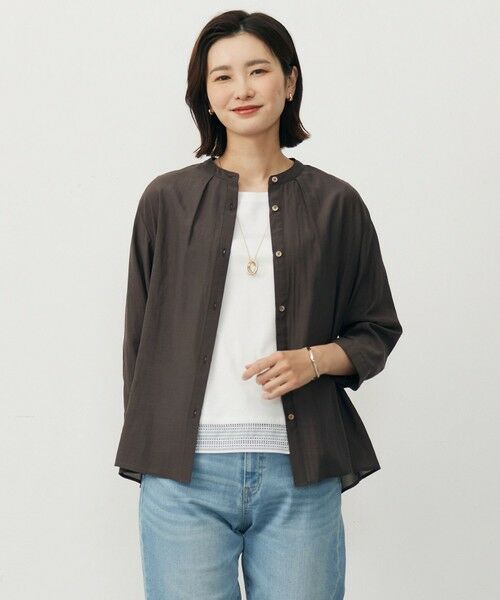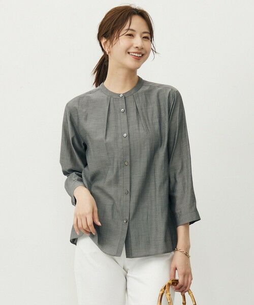 ■デザイン後ろ身頃にタックを入れた、女性らしさの引き立つバックフレアブラウス。前はシャツのようにきちんと見えの細めバンドカラーに、前立てデザインを合わせて端正な印象に仕上げました。裾に向かってゆるやかに広がるシルエットとのコントラストが、着こなしに奥行きをプラス。バックフレアがさりげないアクセントとなり、ヒップ周りもふんわりとカバーしてくれます。袖口は幅広のカフス仕様で、釦の留め方によってふんわりとしたフォルムにも、少しルーズな雰囲気にもアレンジ可能。1枚で着映えしながら、きちんと感と抜け感を兼ね備えた、大人のためのブラウスです。カラーは、どんな色にも合わせやすいグレーシャンブレー(#004)、ニュアンスのある着こなしが叶うブラウン(#030)、やわらかく女性らしいベージュ(#033)、パッと華やかな印象のラベンダー(#083)の4色展開。