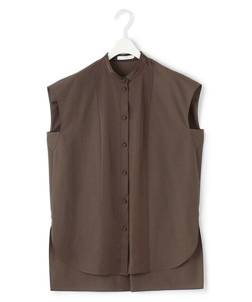 ■デザインオーバーシルエットのノースリーブブラウスです。ストレッチサテン素材を別布として襟・前切り替え・前立てに使用しています。ネイビーにはブラックの配色、ブラウンは同色でのご提案です。腰回りの隠れるチュニックレングスで、ワイドパンツにも細身のパンツにも合うバランスに仕上げています。裾は前をシャツテール、後ろを直線的なカッティングで深めのスリットに仕上げ、抜け感がありつつもシャープな印象にまとめました。前のボタンは共素材のくるみボタンで繊細な雰囲気を演出しています。