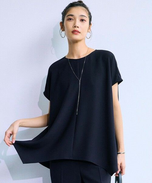 裾に向かって優雅に広がるフレアラインが魅力のプルオーバーです。重くなりがちなミドル丈を、イレギュラーヘム(アシンメトリーな裾)にすることで、リズミカルで軽やかな印象に。気になるヒップやお腹周りを自然にカバーしてくれるのも嬉しいポイントです。裾にデザイン性があるため、ネックラインはシンプルなクルーネックに仕上げました。一枚で着るだけでサマになり、パンツスタイルからスカートまで、様々なボトムスと相性抜群です。オフィスや華やぎの場所にも同素材のテーパードパンツやワイドパンツとのセットアップで大人っぽく着こなせ、カジュアルなワイドパンツに合わせてONにも着られます。カラーは、引き締まった印象のブラック(#005)、上品なネイビー(#075)、抜け感のあるダークブラウン(#035)の3色展開です。
