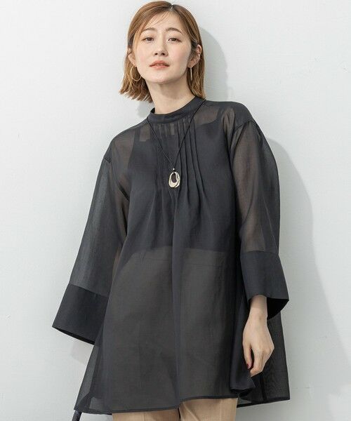 フロントに施されたピンタックが上品なアクセントのチュニックブラウス。トレンド感のあるチュニック丈が、気になるヒップラインをカバーしつつ、すっきりとした印象を与えます。特徴的な太めの袖は、腕がすっきり見えるように仕上げました。パンツスタイルとの相性が抜群で、細身のパンツと合わせれば縦長効果でスタイルアップ、ワイドパンツと合わせればリラックス感のある大人カジュアルスタイルが完成します。カラーは、印象引き締まるブラック(#005)、カジュアルスタイルに映えるダークブラウン(#035)、目を引く深みのあるブルー(#070)の3色展開です。