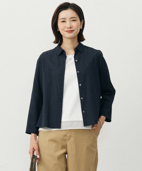 ■素材タテヨコにモノフィラメント糸を使用することで、繊細な透け感と奥行きを表現したシアーチェック素材。表面にはポコポコとした凹凸感があり、肌にまとわりつかず、通気性も良い素材です。軽やかで柔らかな風合いながら吸水速乾性にも優れており夏の装いにぴったりな素材です。