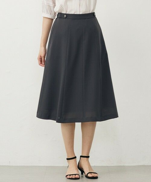■デザイン綺麗に広がるAラインシルエットが魅力のミディスカート。フロントのウエストベルトには、タブ&釦のディテールをあしらい、ワンポイントにしています。身頃は8枚接ぎで構成されており、広がり過ぎず程よく落ち着いたフォルムに。大人の女性にぴったりの控えめで美しいフレアが魅力です。後ウエストはゴム仕様で、きちんと見えつつもラクな着用感を叶えました。ブラウスを合わせたオフィススタイルから、カットソーを合わせたカジュアルな着こなしまで幅広く対応できる、汎用性の高いスカートに仕上げています。総裏地付きで透け感を気にせず着用でき、ロングシーズン活躍します。