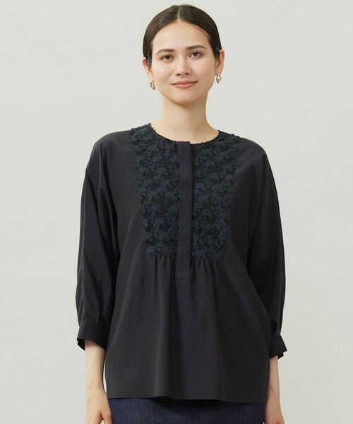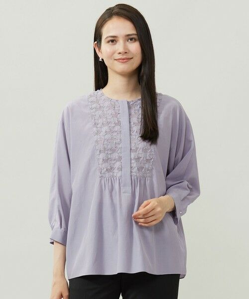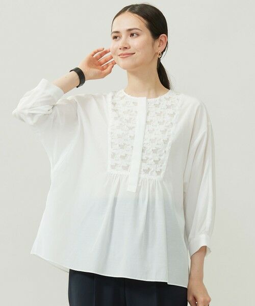 さりげないジャガード素材とドルマン風の袖が印象的なブラウス■デザイン程よくシアーな素材をたっぷりと使用したボリューム感のあるプルオーバーブラウスです。ドルマン風の変形袖で、抜け感を感じられるシルエットです。しなやかで美しいドレープが出る素材で仕立てることで、ボリューム感がありながらもすっきりとした印象になっています。前身頃に施されたカットジャガードと無地素材とのコントラストを効かせた、程よく華やかな印象のブラウスです。■素材ジャガード素材は、タテ糸に細番手のナイロン、ヨコ糸に綿キュプラを使用しております。ナイロンの透け感、光沢感と綿糸のナチュラル感、マットな素材感のコントラストが印象的な素材です。たっぷりと毛足の出た表情で、幾何柄でありながら華やかな印象になっています。無地部分は、タテ糸にアセテートとレーヨン、ヨコ糸にオーガニックコットンを使用したサスティナブル素材です。薄地でありながらも繊細なシャンブレーで表現されたカラーが奥行きを感じられリッチな印象になっています。しなやかで涼し気なタッチと、適度なツヤが上品で、大人っぽい素材です。無地部分タテ糸のアセテートはFSC認証、ヨコ糸のオーガニックコットンはGOTS認証を取得しています。■同素材アイテムクロップド丈ブラウス(BLWRGW0308)