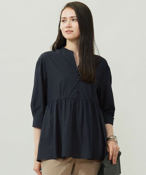 ウエストの切り替えとボリューム感が華やかなペプラムブラウス■デザインウエストの切り替えが特徴のペプラムブラウスです。ラウンドした裾で程よいボリューム感があり、華やかな印象のアイテムです。ネック周りの抜け感が女性らしい印象です。前後差がある着丈なのでスタイルアップ見えも叶います。ボリューム感のあるシルエットなので、テーパードパンツやすっきりとしたシルエットのスカートとバランス良く着て頂けます。■素材ポリエステルと綿の交織シャンブレー素材です。タテのポリエステルは撚糸しているので適度な落ち感とシャリ感が特徴になっています。表面を毛焼きする事で綿の毛羽立ちを抑え、クリアで清涼感がある素材です。ワッシャー加工を施し、柔らかなタッチに仕上げています。■同素材アイテムクロップド丈ブラウス(BLWRGW0307)
