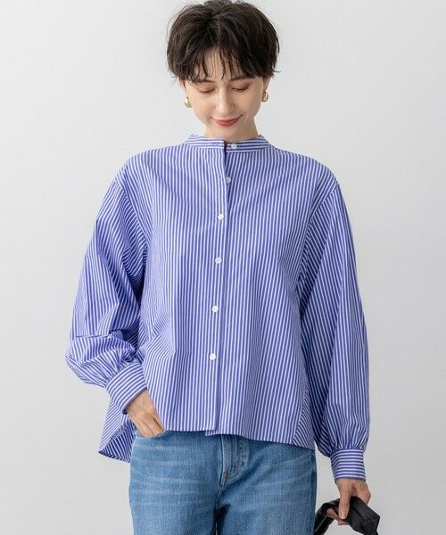 バックスタイルのティアードフリルが華やかなバンドカラーシャツです。裾に向かって広がったAラインシルエットがパンツとの相性も良く、デニムと合わせたカジュアルスタイリングや、キレイめなパンツと合わせた通勤スタイルなど、幅広く着回していただけます。肩回りは程よくフィットさせているので、メリハリのある着こなしが叶います。カラーは上品で応用範囲が広い無地のホワイト(#001)と爽やかなブルーストライプ(#170)の2色展開です。