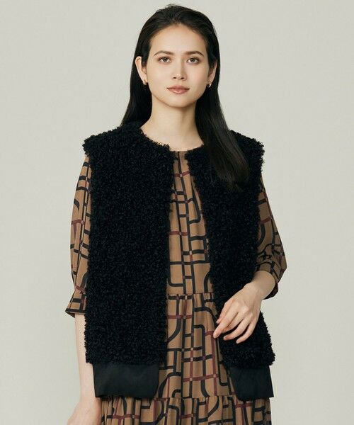 羽織るだけでスタイリングが華やぐエコファー素材のジレ■デザイン裾部分をスエードで切り替えたクルーネックのエコファージレです。柔らかく軽やかなくりくりとした巻き毛が程よくカジュアル感があり、コーディネートしやすいアイテムです。フロントはホックの仕様なので、止めても着て頂けます。ボリュームスリーブのブラウスや、ワンピースとも好相性で、羽織るだけで一気にコーディネートのポイントになります。■素材エコファー部分は、カルガンラムのようなくりくりとした巻き毛が特徴の素材です。長めのファーをカール加工することによって肌触りが良くなり、軽やかでありながら保温性の向上にも繋がっています。別布のスエード部分は、軽く柔らかな仕上がりの人工スエード素材です。