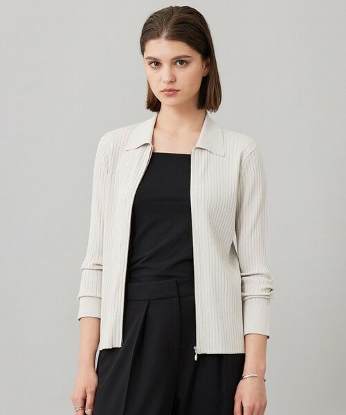 ■デザインハイゲージで丁寧に編みたてられた襟付きのジップアップカーディガンです。テンションのある糸を一緒に編み立て、程良いハリコシとキックバックをプラスしました。リブ組織で縦ラインを強調しつつ、ボディーラインを拾いすぎないサイズ感がポイントです。ファスナーを開けて羽織りとしても、ファスナーを途中止めしインナーを覗かせるレイヤードスタイリングやプルオーバーとしての着用もおすすめです。