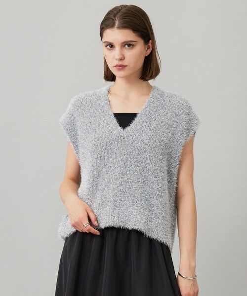 ■デザインラメ糸のシャイニーなきらめきと、フェザーヤーンのふんわり優しい表情がポイントのベスト。すっきりと深く開いた衿元に、ゆったりとしたシルエットに仕上げています。アームホールを広めにとっているので、様々なトップスを合わせてレイヤードスタイルも楽しめます。晩夏から秋の素材を先取りすることでこなれ感がぐっとプラスされ、コーディネートの表情も変化させてくれる優秀アイテムです。