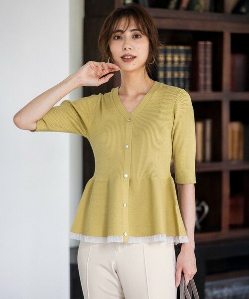 ・ペプラムシルエットがエレガントな印象を与えるニットプルオーバー・フロントのゴールドボタンと、裾からのぞくシアーなフリルが華やかなポイント・立体感のあるペプラムのフレアが腰回りをすっきりカバー・開きすぎていない上品な襟元と、リブでもぴったりしすぎない程よいフォルムで着心地も◎