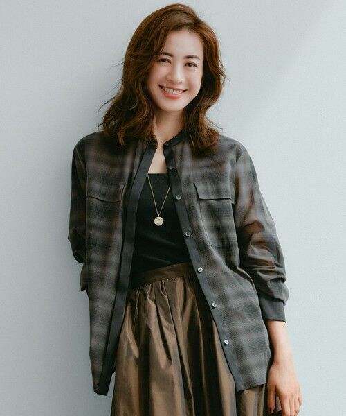 ■デザイン前後差のあるレングスで動きのあるデザインがポイントのバンドカラーシャツです。適度にゆったりとしたサイズ感で、1枚でも、羽織りアイテムとしても着回しが可能で長い時期活躍します。