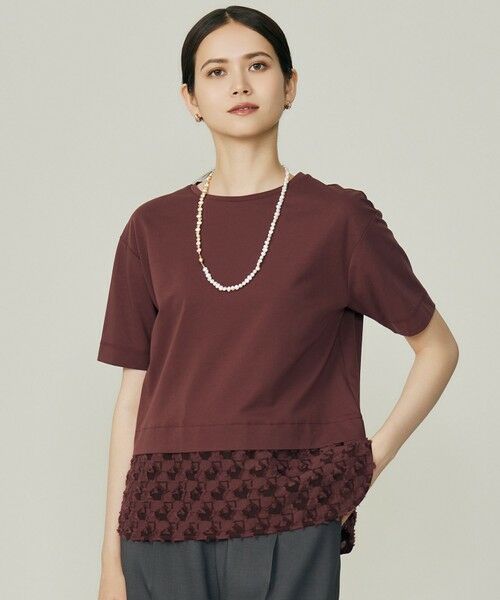 表情感のあるカットジャカードがコーディネートを華やかにするカットソー■デザイン異素材をレイヤード風にブロッキングしたカットソーです。1枚着としてもレイヤードアイテムとしても着て頂けるデザインなので、長い期間コーディネートに取り入れて頂けます。表情のあるカットジャカードは今シーズンも引き続きトレンドとして注目されており、さらりと着るだけで今年らしいスタイリングを完成させてくれます。■素材本体は、ストレッチ性と反発性とドレープ性のある素材を使用しています。綿特有の強い光沢のある上品な素材です。別布部分は、タテ糸に細番手のナイロン、ヨコ糸に綿キュプラを使用することで陰影が付いた幾何調の柄を表現しています。