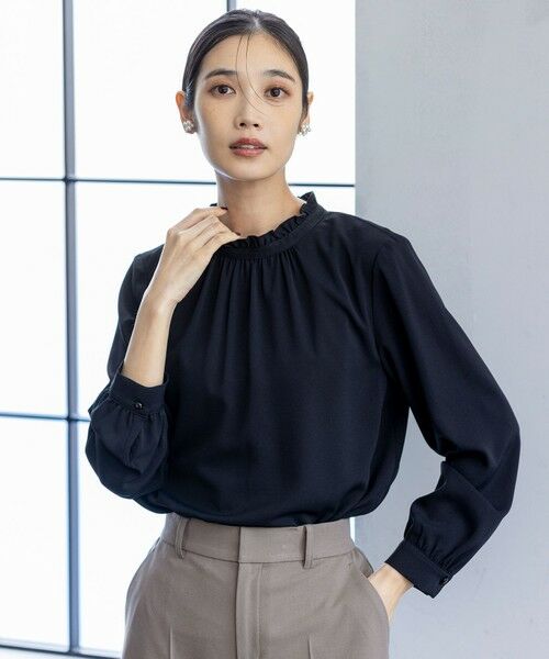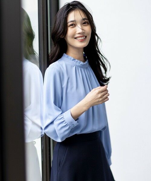 ・定番人気のフリルネックデザイン・甘すぎず、上品に着られる程よいフリル感・きちんと感を演出する袖元のカフスデザイン・ジャケットインはもちろん、ニットとのレイヤードやジャンパースカート合わせにもぴったりなインナーブラウス・前後差のある程よい着丈と脇スリットで、ニットレイヤードにも最適な裾周りにアップデート