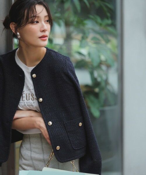 ・ゴールドボタンがアクセントのノーカラージャケット。・裏地無し仕様のため軽量で、リラックス感のある着心地に仕上がっています。・ネップツイード素材の表情感が程よいカジュアルさをプラス。立体的な袖のシルエットもポイント。・カーディガン感覚で気軽に羽織れるきちんと感を兼ね備えたミニマルなアイテムです。