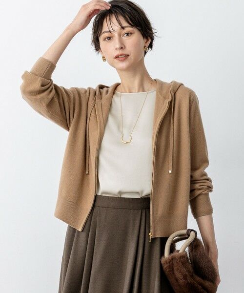 毎年ご好評いただいている、大人のためのニットパーカーが今年も登場!上質なカシミヤ素材で丁寧に編み立てた一枚は、程よいゆとりのあるシルエットで、リラックス感がありながらも上品さがあるのが魅力。顔周りを華やかに見せるゴールドのファスナーがアクセントとなり、カジュアルなパーカーをワンランク上の洗練された印象に引き上げてくれます。デニムと合わせて大人のカジュアルスタイルに、きれいめなスラックスやスカートと合わせればエレガントさも漂うお出かけスタイルに。羽織りとしても、一枚着としてもサマになるため、幅広いコーディネートでお楽しみいただけます。肌寒い季節に、極上の肌触りと暖かさで、日常を贅沢に彩るアイテムです。カラーは、カジュアルスタイルに映えるライトグレー(#003)、パッと目を引くオレンジ(#020)、上品な印象のベージュ(#033)、やわらかな雰囲気のキャメル(#034)、元気で明るいイエロー(#040)、洗練された雰囲気のブルー(#070)、さわやかなスカイブルー(#072)の7色と豊富なラインナップです。