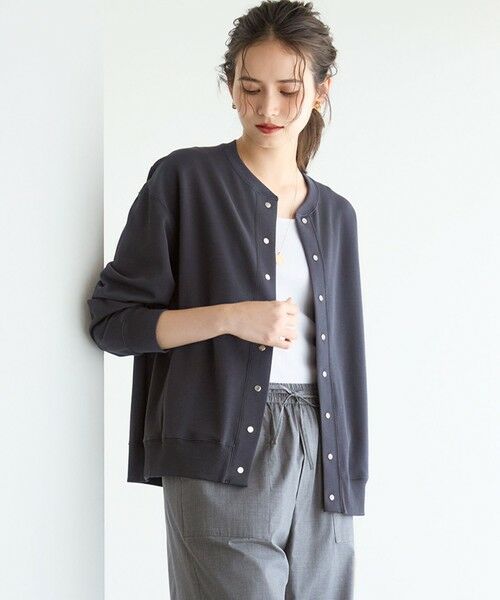 スナップボタンがアクセントになった、ブルゾンタイプのライトアウターです。後ろの裾にタックを施し、Gジャンのようなふくらみのあるデザインに仕上げました。ソフトコーデュロイのスカートと合わせ、Tシャツの上に軽く羽織るスタイルもおすすめです。カラーは、黄味がありなじみの良いアイボリー(#002)、落ち着いた印象のグレー(#004)、合わせやすいネイビー(#075)の3色展開です。