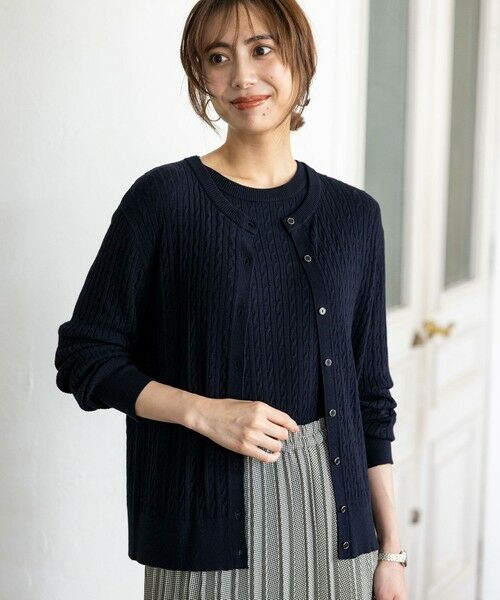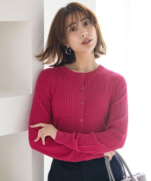 ・気品のある細めのケーブル・トレンドの刺繍ディテールが今年らしいポイントに・同色染めの金縁ボタンが上品・ケーブル編みとカラーが秋らしい雰囲気を演出