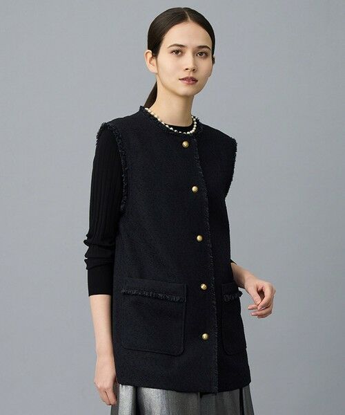 いろんなシーンで着て頂ける万能なジレ■デザインボクシーながらややコクーンシルエットのジレです。タイト過ぎないボディサイズが程よいリラックス感を感じられます。共フリンジと金属ボタンがアクセントになっています。ジレアップとして同素材のパンツ(PRWMLS0406)を合わせてかしこまったシーンから、カジュアルなボトムと合わせてデイリーシーンにも着て頂けます。■素材ループ状のリング糸の凹凸感がツイーディーな表情の素材です。ポリエステルの適度な落ち感とレーヨンリング糸の光沢が特徴で、大人でも着やすく幅広いシーンで活躍します。■同素材アイテムジャケット(JKWRCW0406)ジャンパースカート(OPWRLS0406)2タッククロップドパンツ(PRWRLS0406)クロップドパンツ(PRWRCW0406)ストレートスカート(SKWRCW0406)