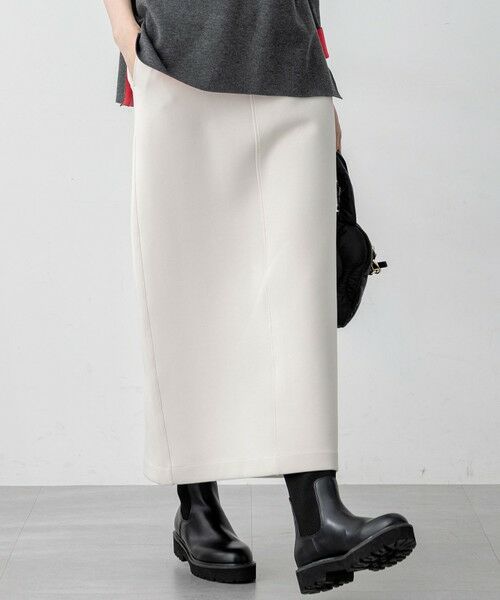 ダンボール素材でつくられたストレートシルエットのスカート。サイドに切り替えを入れ、立体的にすることでスッキリと見えるラインに仕上げました。膨らみののあるダンボール素材はヒップラインを拾わないため、細身のシルエットでも穿きやすい1枚。ウエストはゴム仕様でストレスフリーな穿き心地も魅力です。カラーは、カジュアルスタイルに映えるライトグレー(#003)、モードな印象をプラスするブラック(#005)、アイボリー寄りの明るいベージュ(#033)の3色展開です。
