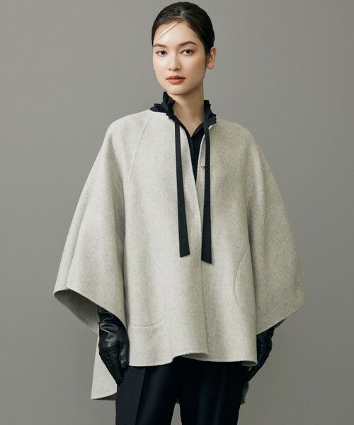 女性らしいデザインの上品なポンチョ■デザインさらりと羽織れる程よいボリューム感のポンチョです。ラグランスリーブのような斜めのハギを入れることで女性らしい印象です。ハギの切替えを利用したポケット付きです。前後差のあるデザインなので、スカートやパンツどちらにも合わせやすいアイテムです。フロントの開きは、ホックの仕様になっています。軽やかなリバー素材を用いて、リバー仕立てで上品に仕上げました。■素材16番カシミヤ混の原料を使用したリバーコート素材です。細い糸であることに加えカシミヤを入れることで軽く柔らかく、両面メルトン仕上げでツヤ感を出しました。TOPの糸の深みのある色合いが上質な素材です。