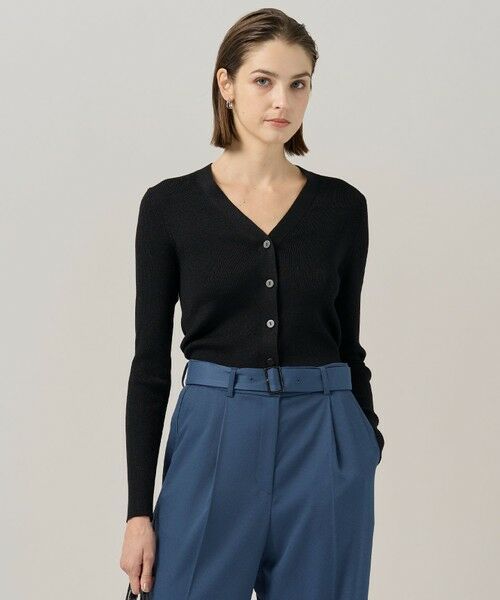 ■デザインシャープなVネックラインがモードな印象のリブカーディガン。縦長シルエットで着やせ効果も期待できます。羽織としてはもちろん、前を留めてプルオーバーとしても着用でき、ベルトをプラスしたスタイリングもおすすめです。