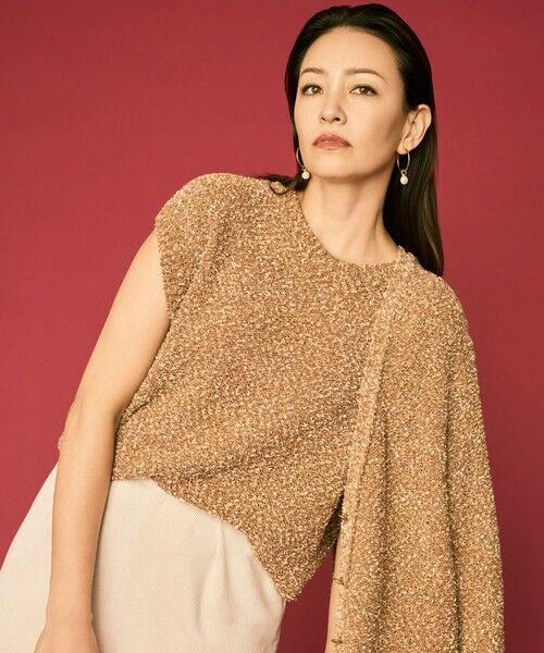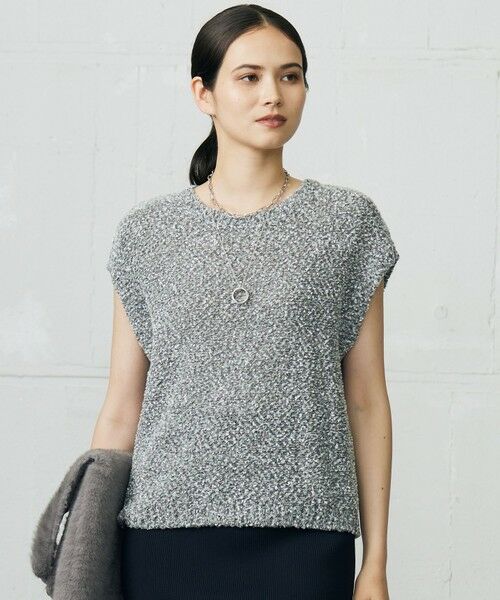 1枚でも、レイヤードアイテムしてもコーデを華やかにしてくれるニットベスト■デザインシンプルで使いやすい、やや肌離れしたフォルムのニットベストです。素材自体に華があるので、スリーブレスでも着て頂け、寒くなってレイヤードアイテムとしてもお使い頂けます。スタイリングに組み込みやすい華やかなトッピングアイテムです。■素材和紙、ラメフラッグヤーン、ウールブークレなど表情、混率共に性質の大きく異なる素材を撚糸することで、色合いや表面感がユニークで華やかな印象に仕上げたミドルゲージファンシーヤーンです。■同素材アイテムカーディガン(KRWRGW0459)