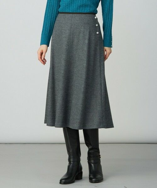 ■デザイン昨年ご好評いただいた、程よいセミフレアシルエットで他アイテムとも合わせやすい、大人な印象のスカート。シルエットはそのままに、今年はウエスト部分のパイピングをスウェード素材に変え、高級感をプラス。釦も昨年とは異なるデザインを使用し、細部にまでこだわりました。丈は長すぎず、程よいバランスに仕上げているため、カジュアルになりすぎず、幅広いシーンで活躍します。さりげない素材の変化と洗練されたディテールが、大人の日常に上品なアクセントをプラスする1着です。