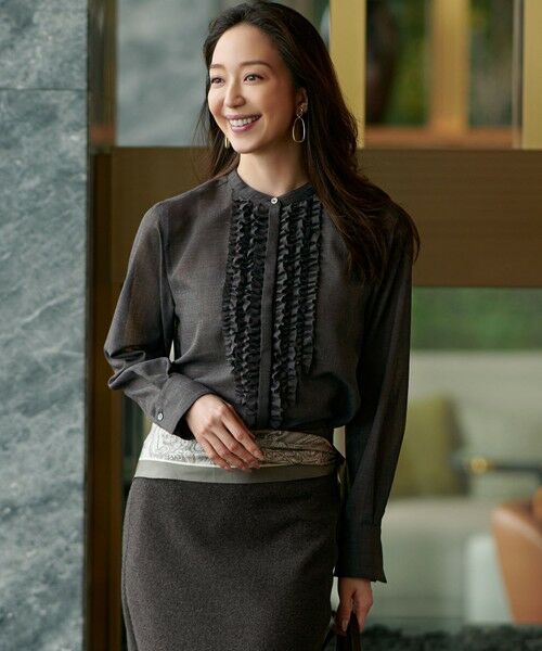 フリルディテールが華やかながら、こなれた印象でスタイリッシュな雰囲気の1着です。1枚着としてはもちろん、肌寒くなってきてからは、タートルネックをインナーにしたレイヤードスタイルや、カーディガンのインナーブラウスとして着まわしたりと、ロングシーズン着用いただける汎用性の高いアイテムです。ワイドパンツを合わせた今季らしいスタイルもおすすめです。カラーは、こなれた印象のグレー(#004)と、品の良さを引き立てるネイビー(#075)の2色展開です。