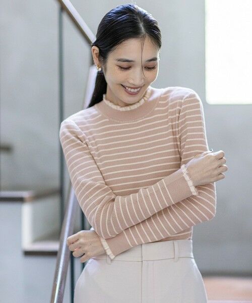 ・細めのリブ編みが上品なハイネックニットプルオーバー・襟と袖口のフリル部分には少しシアーな素材を使用し、華やかさをプラス※・無地とボーダーの2タイプ展開で、シーンに合わせて選べます