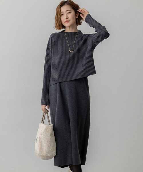 ワイドリブで編み上げた短丈プルオーバーと総針編みVネックのジャンスカ風ワンピースがセットになったアイテムです。プルオーバーは少し立ち上がりのあるモックネックが新しいデザインです。程よく身幅にゆとりがあるので、セットのワンピースの上に重ねても、ワンピースのインに重ねてあわせても楽しめます。やや短めの丈感でお手持ちのシャツやカットソーをレイヤードすることで気温感にあわせた着回しも自在です。ワンピースもやや広めのVネックのため、カットソーやタートルネックをインにあわせてジャンスカ風に着回しを楽しめるデザインです。カラーは洒落感のあるチャコールグレー(#004)、柔らかな印象のベージュ(#033)、品のある濃色ネイビー(#075)の3色展開です。