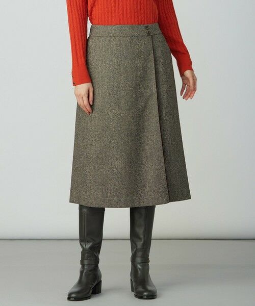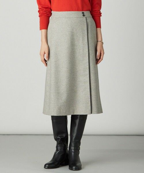 ■デザインラップ風の切り替えがポイントのひざ下丈のAラインスカート。すっきりとしたウエストラインの、ダブルボタンとモールパイピングがデザインポイント。シルエットは合わせるトップスを選ばないベーシックなAラインです。着丈も長すぎず短すぎずの絶妙なバランスで、ジャケットやニットとの相性も良く、秋冬の着こなしに頼れる1着です。生地表面には、控えめなきらめきのラメ糸を織り込み、光の加減でほんのりとした華やかさが漂うデザインに。見た目に反して軽やかな着心地で、気温が下がりきらない時期から季節感を先取りできる、アイテムに仕上げました。