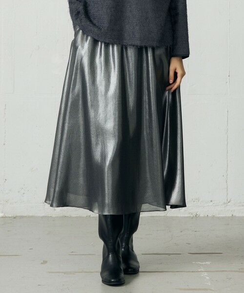 繊細な煌めきが華やかなフレアスカート■デザインウエストにギャザーが入ったフレアスカートです。ギャザーとフレアの立体感が素材の繊細な光沢感を際立たせ、動くたびに裾がなびく華やかなデザインです。ウエストはゴムを使用しているので、快適な着心地です。ニットなど光沢のない素材とコントラストを効かせたコーディネートもおすすめです。イギリスの老舗ティーハウスFarrer’s(ファーラーズ)とのコラボレーションアイテムです。【Farrer’s】英国湖水地方で200年以上続くティーハウス。ホテル、レストランをはじめ現地の方々に愛される紅茶は、軟水向けにブレンドされているため、日本でも変わらない味が楽しめます。歴史ある建物でもあるティーハウスでは、美味しい英国菓子や紅茶を求め、連日お客様で賑わっています。※画像はサンプルを使用しております。実際にお届けする商品はウエスト部分がサテン見えするゴムへ変更になります。■素材シアーなボイル素材に、繊細にキラキラ輝く箔プリントを施したシャイニー素材です。しなやかな落ち感と軽やかな素材感のあるトレンド素材です。※箔プリントは永久的なもので無く、もまれたり擦れたりすると脱落しやすくなっております。またクリーニングを繰り返す事により多少色が薄くなる事があります。