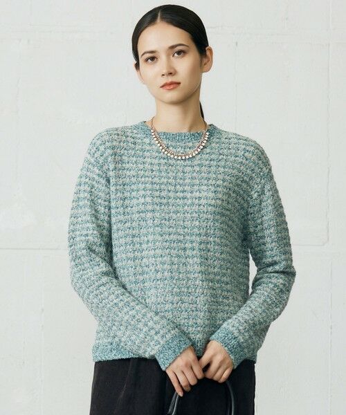 素材で表現されたツイード柄がポイントのニット■デザインツイード柄を表現したニットです。サイズ感をややコンパクトにお作りすることで、スタイリングにメリハリを付けるアイテムとして着て頂けます。■素材モヘアが糸の表面に露出することで、雲霧状のモヘアが軽やかなスタイルを表現しています。そこに細番手の羊毛を加えることで、肌に優しく、羽のようなふわふわとした手触りを持たせたキッドモヘアになっています。表情豊かな2色の杢のループヤーンを掛け合わせツイード柄をジャカードで表現したミドルゲージのファンシーヤーンです。