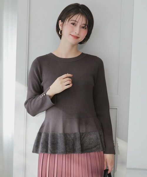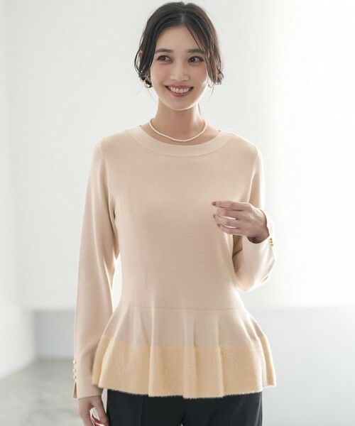 ・裾のペプラム×フェザーが可愛らしいニットプルオーバー・上品な開き加減のボートネック・袖口のゴールドボタンもポイントに