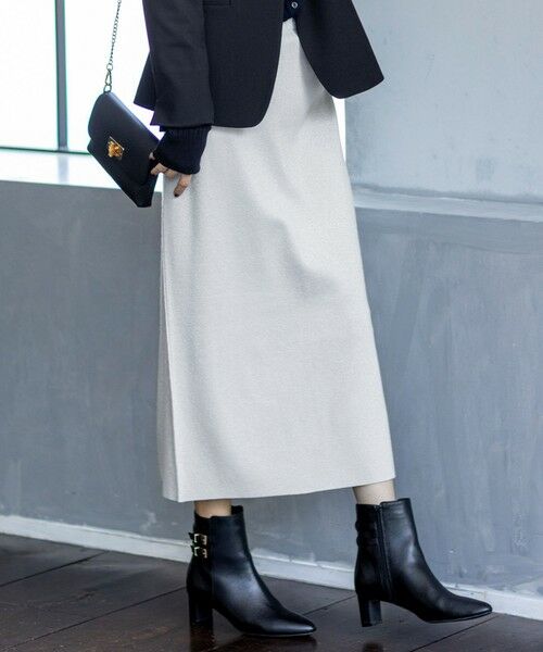 ・スッキリとしたストレートラインのニットスカート・後ろ裾にスリットをいれているので足さばきよく着用できます・細見えする両脇ライン