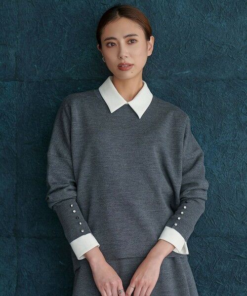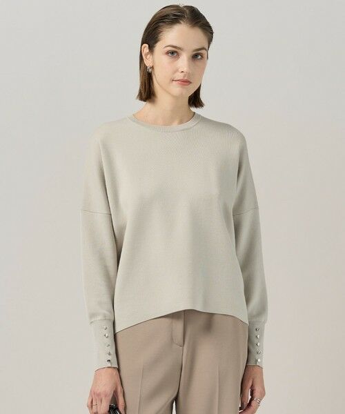 ■デザインゆったりシルエットが大人コンフォータブルな印象のニットプルオーバー。程よい肉感のリラックス感あるボディーと、すっきりコンパクトな腕周りで、メリハリのあるサイジングがスタイリッシュでモードな印象に見せてくれます。裾に向かってサイズダウンしているので、どんなボトムと合わせてももたつかずすっきりと着られて、ラウンドヘムで軽さのあるデザインに仕立てました。袖口に並べたメタル釦もポイントで、一枚でサマ見えすること間違いなしのデザインプルオーバーになっています。同シリーズのフレアスカートとのニットアップスタイリングもおすすめです。