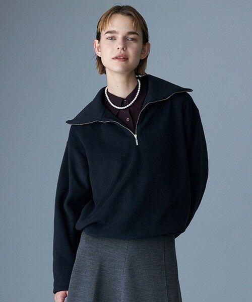 ■デザイン程よくゆとりを持たせたリラックスシルエットのハーフジッププルオーバーです。軽さとふくらみのある表情感で、きれいめスタイリングの外しアイテムとして使える一枚です。身幅に余裕のあるシルエットなので、季節に合わせてインナーにロングスリーブTシャツやシャツブラウスなどを重ねて、様々なレイヤードコーディネートを楽しめます。前後差のある裾にはドロストコードを入れているので、絞りを調節してフォルムのアレンジも可能です。ジップのカラーはミディアムグレー(003)とネイビー(075)がシルバー、ブラック(005)がゴールドです。
