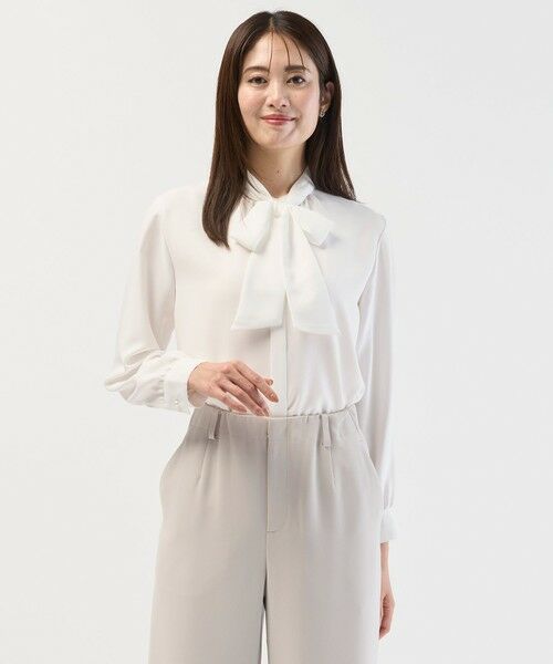 ■デザインバンドカラーに比翼仕立てを取り入れた、エレガントな印象の前開きブラウス。襟端にはレースをあしらい、台襟とカフス部分にはパール釦を配して、華やかなアクセントをプラスしました。洗練されたデザインと快適な着心地を兼ね備え、オンにもオフにも活躍する1着です。付属のボウタイは取り外し可能で、シーンに合わせて表情を変えて楽しめます。美しいドレープが女性らしい凛とした印象を与え、オケージョンから通勤スタイルまで、幅広いシーンに使えるアイテムです。