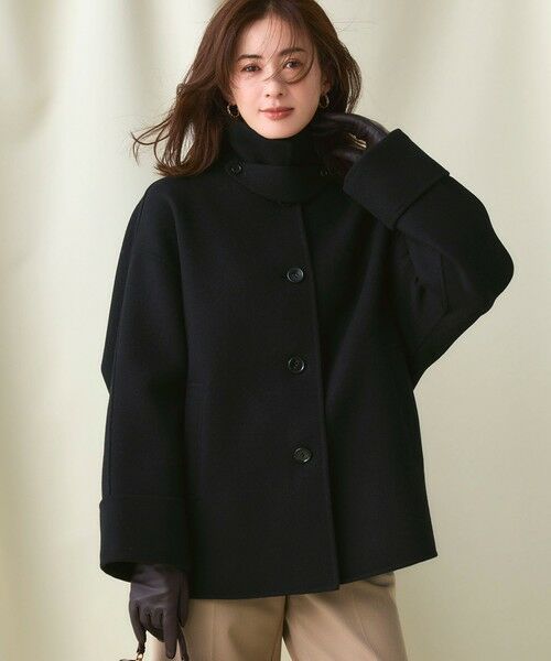 立体的な袖のフォルムが魅力的な、ステンカラーコート。首元のチンフラップを留めて襟を立たせることでエレガントな印象になりつつ、防寒にも◎。 ゆったりとした身幅と袖感なので、インナーに左右されず、着回しがききます。腰回りもしっかりカバーできるレングスなので、スカート・パンツどちらでもバランスを取りやすいデザインです。リバー仕立ての軽さと暖かさを併せ持った、NEWデザインアウターです。カラーは柔らかく軽やかなオートミール(#033)、着映え力抜群なティールグリーン(#064)、こなれた印象のミディアムグレー(#004)、王道主力カラーのブラック(#005)の4色展開です。
