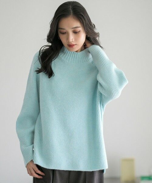 ・大人な印象に仕上がるハイネックニット・身頃はややゆとりのあるサイズ感で・立体感のある片畦編みでざっくりとカジュアル感をプラス・前後差のある着丈でヒップ周りもカバー可能・幅広いボトムスにマッチするサイドスリットデザイン・ボーダーは袖口にバイカラーラインを入れることでアクセントに