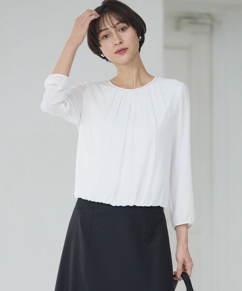 首元に繊細なボールチェーンをあしらった品の良いブラウス。顔周りに華やかさと上品な輝きをプラスします。フロントに入ったタックデザインが、立体感と優雅なドレープを生み出し、気になるボディラインを自然にカバー。内側には肌触りの良いカットソー生地がドッキングされているため、インナーの透けが気になりにくい仕様です。裾は裏地と一体になったバルーンシルエットで、ボトムスにインしなくても自然と決まるのが嬉しいポイント。オフィスでのセットアップスーツのインナーとしてはもちろん、きれいめパンツやスカートと合わせてお食事会や学校行事にも。きれいめなスタイルで活躍する、着回し力抜群の一枚です。 カラーは、清潔感あふれるホワイト(#001)、優しく上品な印象のベージュ(#033)、爽やかで洗練されたスカイブルー(#072)の3色展開です。