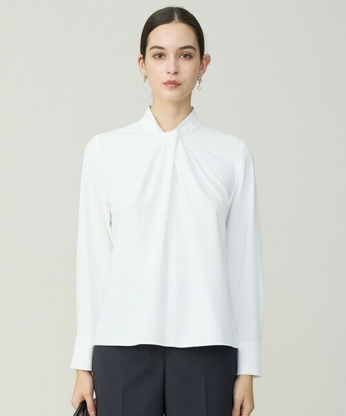 ■デザインボウタイライクなカラーデザインが特徴のブラウスです。一枚での着回しはもちろん、オフィスシーンでのスーツインナーにも活躍します。ジャケットや羽織を羽織った際も、首元のドレープデザインが上品に女性らしさを演出します。きちんと見えながら、ストレッチ性のある素材、背面ファスナーで脱ぎ着もしやすく快適な着心地を叶えます。