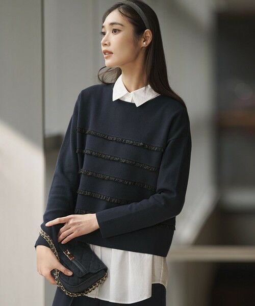 前後身頃にあしらわれた、ピコットミシンで丁寧に縁取られた薄手のフリルが、コーディネートを華やかに彩るプルオーバーです。高見えするしっかりとしたミラノリブ編みで、上品な印象を与えます。袖はすっきりとしたストレートライン、襟元は細幅でクラシックな雰囲気を演出します。やや短めの着丈は、ハイウエストのパンツやスカートとの相性も抜群です。コートやジャケットを羽織った際にも、袖口や裾から覗くフリルのボーダーがさりげないアクセントとなり、着こなしに奥行きを与えます。カラーは、洗練された印象のグレー(#004)、シックで着回し力抜群のブラック(#005)、知的で落ち着いた雰囲気のネイビー(#075)の3色展開です。