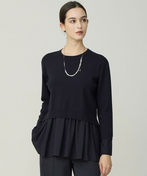 ■デザインクルーネックニットの裾にシャツ地のペプラムをドッキングしたプルオーバーです。異素材の組み合わせが着映えを叶える一枚で、細身のパンツやセミワイドパンツ、タイトスカートと合わせたコーディネートがおすすめです。